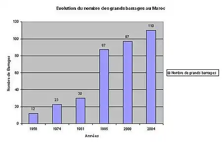 De nombreux cours d'eau moins importants (les oueds) peuvent même être à sec une partie de l'année (ou même plusieurs années de suite dans les zones pré-désertiques). Le manque d'eau et la grande variabilité des débits représentent un grand problème pour le Maroc, notamment pour l'agriculture (irriguée ou non). Par ailleurs, le Maroc est confronté à une situation de crise aiguë du stress hydrique, la consommation de sa population dépassant largement la quantité d'eau disponible. Ses ressources en eau par habitant ont été divisées par cinq entre 1960 et 2019, passant de 2 500 m3 par habitant et par an à 500 m3. Le Royaume occupe le 23e rang des pays les plus menacés par les pénuries d'eau, selon le World Resources Institute (WRI)[32].