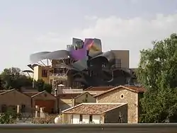 Le pari du loisir se localise principalement dans le nouveau bâtiment projeté par Frank Gehry (connu pour le Musée Guggenheim Bilbao), une construction avant-gardiste qui se convertit dans le symbole de Marqués de Riscal. Ce bâtiment, bâti en pierre grès et une couverture de titane, héberge un hôtel de la chaîne Starwood Hotels & Resorts et deux restaurants, le Bistró 1860 et le Marqués de Riscal, Récompensé en 2011 avec une Étoile Michelin. La couverture de l'hôtel a pour objectif de représenter le vin rouge (couleur rose), la maille caractéristique dorée des bouteilles de Marqués de Riscal (or) et la capsule des bouteilles (argent)[8].