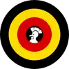 Image 1: Cocarde: en 4 cercles: Extérieur noir, milieu extérieur jaune, milieu intérieur rouge, centre blanc avec une Grue royale au milieu. Image 2: Ancienne cocarde: en 4 cercles: extérieur noir, milieu extérieur rouge, milieu intérieur jaune, centre noir avec une tête de Grue royale au milieu.