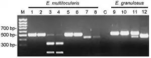 Exemple de gel d'agarose de produits de PCR avec le marqueur de poids moléculaires connus sur la gauche