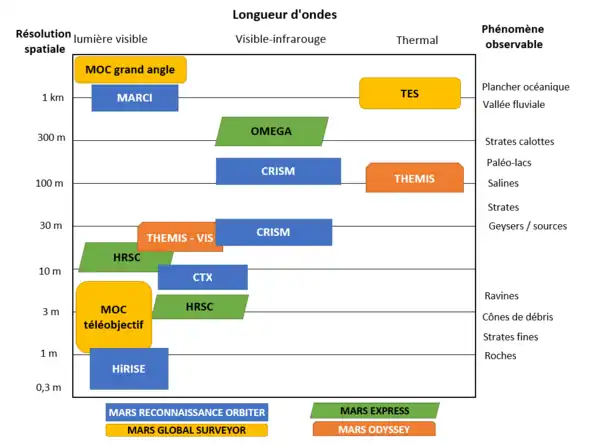 - OMEGA (Observatoire pour la Minéralogie, l'Eau, les Glaces et l'Activité) est un spectromètre opérant dans le proche infrarouge et les micro-ondes (gamme de longueurs d'onde de 350 µm à 5,1 µm). Il étudie la composition minéralogique de la surface et la distribution de certains composés de l'atmosphère, et a été conçu par l'Institut d'astrophysique spatiale d'Orsay[15] ;