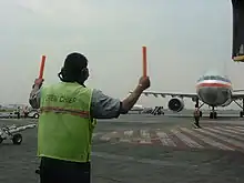 - (en) Cet article est partiellement ou en totalité issu de l’article de Wikipédia en anglais intitulé « Aircraft marshalling » (voir la liste des auteurs).