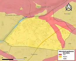La commune est vulnérable au risque de mouvements de terrains constitué principalement du retrait-gonflement des sols argileux[23]. Cet aléa est susceptible d'engendrer des dommages importants aux bâtiments en cas d’alternance de périodes de sécheresse et de pluie. 99,4 % de la superficie communale est en aléa moyen ou fort (76,3 % au niveau départemental et 48,5 % au niveau national). Sur les 1 431 bâtiments dénombrés sur la commune en 2019, 1 431 sont en aléa moyen ou fort, soit 100 %, à comparer aux 90 % au niveau départemental et 54 % au niveau national. Une cartographie de l'exposition du territoire national au retrait gonflement des sols argileux est disponible sur le site du BRGM[24],[Carte 3].