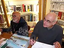 Claude Marti et Patrice Cartier lors d'une séance de dédicaces à Carcassonne en 2015. - Claude Marti, poésies et chansons, par Roland Pécout, 1974, Seghers