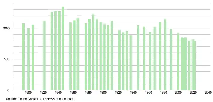 L'évolution du nombre d'habitants est connue à travers les recensements de la population effectués dans la commune depuis 1793. Pour les communes de moins de 10 000 habitants, une enquête de recensement portant sur toute la population est réalisée tous les cinq ans, les populations légales des années intermédiaires étant quant à elles estimées par interpolation ou extrapolation[21]. Pour la commune, le premier recensement exhaustif entrant dans le cadre du nouveau dispositif a été réalisé en 2004[22].