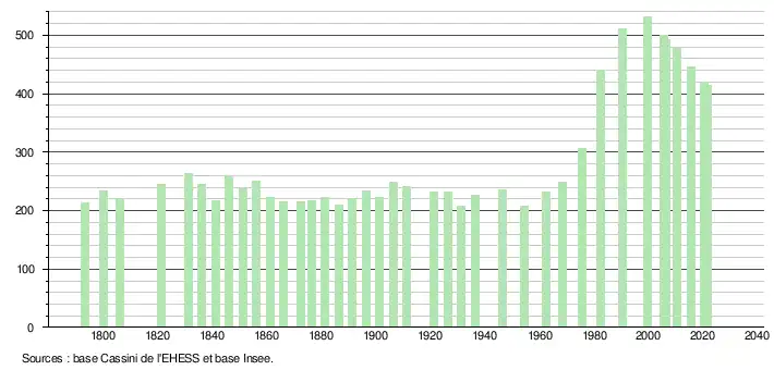 L'évolution du nombre d'habitants est connue à travers les recensements de la population effectués dans la commune depuis 1793. Pour les communes de moins de 10 000 habitants, une enquête de recensement portant sur toute la population est réalisée tous les cinq ans, les populations légales des années intermédiaires étant quant à elles estimées par interpolation ou extrapolation[21]. Pour la commune, le premier recensement exhaustif entrant dans le cadre du nouveau dispositif a été réalisé en 2005[22].