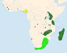 L'aire de répartition de cette espèce s'étend sur la Sierra Leone, le Liberia, la Côte d'Ivoire, le Nigeria, le Cameroun, la Guinée équatoriale, le Gabon, la République démocratique du Congo, l'Ouganda, l'Éthiopie, le Kenya, la Tanzanie, le Rwanda, le Burundi, le Malawi, la Zambie, le Mozambique, le Zimbabwe, le Swaziland, le Lesotho, l'Afrique du Sud, le Botswana, la Namibie, l'Angola, Madagascar, les Comores et Mayotte.