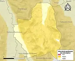 Le retrait-gonflement des sols argileux est susceptible d'engendrer des dommages importants aux bâtiments en cas d’alternance de périodes de sécheresse et de pluie[28]. 85 % de la superficie communale est en aléa moyen ou fort (59 % au niveau départemental et 48,5 % au niveau national)[Carte 4]. Depuis le , en application de la loi ELAN, différentes contraintes s'imposent aux vendeurs, maîtres d'ouvrages ou constructeurs de biens situés dans une zone classée en aléa moyen ou fort[Note 6],[29].