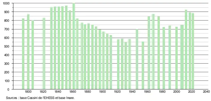 L'évolution du nombre d'habitants est connue à travers les recensements de la population effectués dans la commune depuis 1793. Pour les communes de moins de 10 000 habitants, une enquête de recensement portant sur toute la population est réalisée tous les cinq ans, les populations légales des années intermédiaires étant quant à elles estimées par interpolation ou extrapolation[43]. Pour la commune, le premier recensement exhaustif entrant dans le cadre du nouveau dispositif a été réalisé en 2007[44].