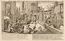 Les massacres au Châtelet et à Bicêtre. Gravure anonyme, Paris, BnF, département des estampes et de la photographie, 1792. | |