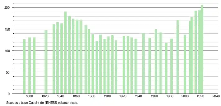 L'évolution du nombre d'habitants est connue à travers les recensements de la population effectués dans la commune depuis 1793. Pour les communes de moins de 10 000 habitants, une enquête de recensement portant sur toute la population est réalisée tous les cinq ans, les populations légales des années intermédiaires étant quant à elles estimées par interpolation ou extrapolation[24]. Pour la commune, le premier recensement exhaustif entrant dans le cadre du nouveau dispositif a été réalisé en 2008[25].