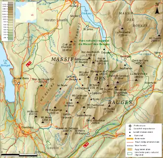 Le massif des Bauges, ou plus communément les Bauges, est un massif montagneux calcaire des Préalpes françaises du nord, se situant à cheval sur les départements de la Savoie et de la Haute-Savoie et culminant à plus de 2 200 mètres d'altitude. Il constitue une région naturelle.