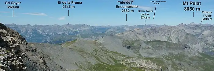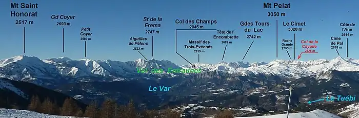 Dans son acceptation la plus courante, le terme massif du Pelat désigne uniquement la partie la plus élevée, constituée des sommets du mont Pelat et du Cimet.
