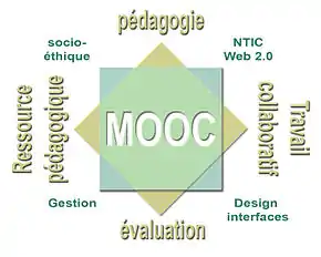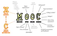 Il existe deux grands types[8] de cours en ligne ouverts et massifs : les xMOOC qui visent à valider les compétences acquises en délivrant un certificat de réussite et les cMOOC dont les objectifs d’apprentissage sont ouverts et dont les participants créent dans une large mesure le contenu[9]. Ces cMOOC sont fondés sur la théorie de la connectivité et sur une pédagogie ouverte, qui s'appuient sur des réseaux de contenus et d'individus[10].