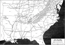 Quand éclate la guerre en 1861, il y a environ 30 000 miles[note 1] de lignes de chemin de fer déployées dans le pays et sur ce chiffre, quelque 9 000 miles[note 2] le sont dans les États du sud qui feront sécession[5].