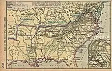 Le sud bénéficia lui aussi du boom ferroviaire des années 1850 - l'extension de son réseau étant même supérieur en termes kilométriques à celle des chemins de fer de la Nouvelle-Angleterre. La Virginie - qui deviendra l'un des principaux théâtres d'opérations du conflit à venir (cf carte 4) - en fut le principal bénéficiaire, les autres futurs États sécessionnistes restant cependant à la traîne[note 6]. Par ailleurs, les impressionnants termes « bruts » des statistiques ferroviaires sudistes[8] sont essentiellement le reflet du développement régional anarchique évoqué plus haut, aucun plan concerté d'ensemble n'ayant été mis en œuvre et aucun grand axe ferroviaire n'ayant été tracé dans cette partie du territoire américain[note 7]. Les lignes de l'est du Mississippi furent donc techniquement organisées en quatre réseaux à différents écartements, larges et standard tandis que les lignes occidentales, essentiellement des lignes locales, utilisaient un autre écartement large.