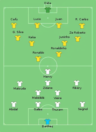 Dans le temps additionnel de la première mi-temps, Patrick Vieira touche le ballon de la tête d'un coup franc de Zinédine Zidane, sans succès. À la quarante-huitième minute, Zidane tire de nouveau un coup franc situé à la limite de la surface de réparation, mais le ballon est contré par le mur brésilien[8].