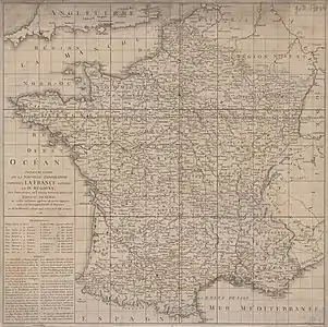 - Plan figuré des cinq premières Divisions de la Nouvelle Topographie du Royaume de France pour servir à reconnoître les Bans dont les souscripteurs voudroient faire lever les Cartes Particulières, Par M. Robert de Hesseln, Censeur Royal ; Gravé par Guill. De la Haye.