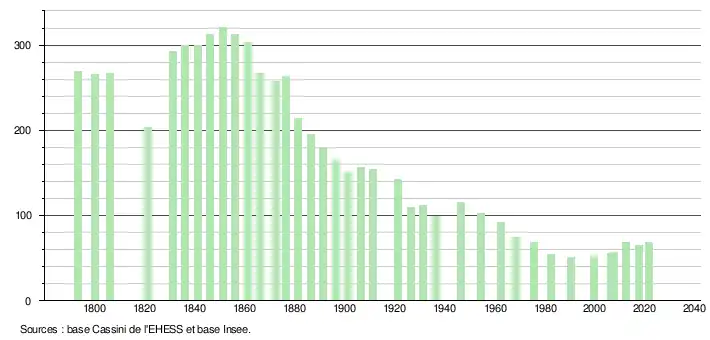 L'évolution du nombre d'habitants est connue à travers les recensements de la population effectués dans la commune depuis 1793. Pour les communes de moins de 10 000 habitants, une enquête de recensement portant sur toute la population est réalisée tous les cinq ans, les populations légales des années intermédiaires étant quant à elles estimées par interpolation ou extrapolation[16]. Pour la commune, le premier recensement exhaustif entrant dans le cadre du nouveau dispositif a été réalisé en 2007[17].