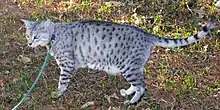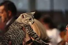 Mau égyptien black silver spotted tabby présenté à l'exposition féline de Hyvinkää en Finlande. | |