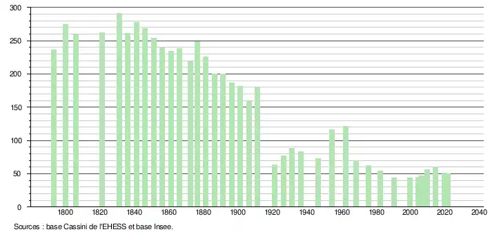 L'évolution du nombre d'habitants est connue à travers les recensements de la population effectués dans la commune depuis 1793. Pour les communes de moins de 10 000 habitants, une enquête de recensement portant sur toute la population est réalisée tous les cinq ans, les populations légales des années intermédiaires étant quant à elles estimées par interpolation ou extrapolation[15]. Pour la commune, le premier recensement exhaustif entrant dans le cadre du nouveau dispositif a été réalisé en 2004[16].