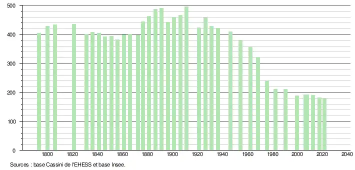 L'évolution des naissances et décès de 1968 à 2007 est la suivante (INSEE) :