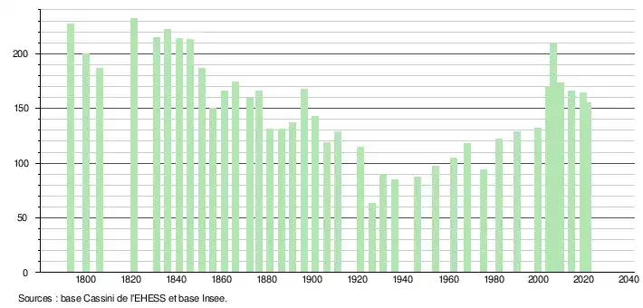 L'évolution du nombre d'habitants est connue à travers les recensements de la population effectués dans la commune depuis 1793. Pour les communes de moins de 10 000 habitants, une enquête de recensement portant sur toute la population est réalisée tous les cinq ans, les populations légales des années intermédiaires étant quant à elles estimées par interpolation ou extrapolation[26]. Pour la commune, le premier recensement exhaustif entrant dans le cadre du nouveau dispositif a été réalisé en 2004[27].
