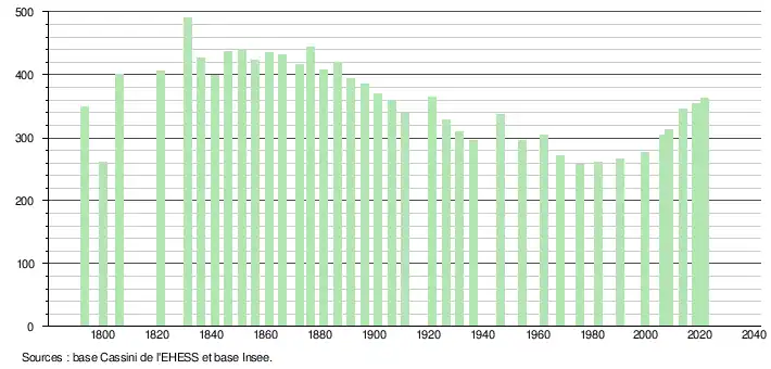 L'évolution du nombre d'habitants est connue à travers les recensements de la population effectués dans la commune depuis 1793. Pour les communes de moins de 10 000 habitants, une enquête de recensement portant sur toute la population est réalisée tous les cinq ans, les populations légales des années intermédiaires étant quant à elles estimées par interpolation ou extrapolation[23]. Pour la commune, le premier recensement exhaustif entrant dans le cadre du nouveau dispositif a été réalisé en 2008[24].