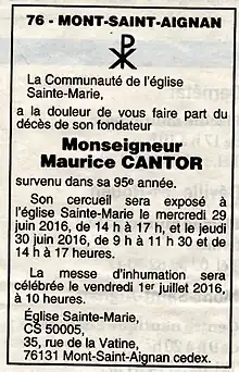 - [https://actu.fr/normandie/mont-saint-aignan_76451/deces-de-monseigneur-cantor-fondateur-de-leglise-sainte-marie-pres-de-rouen_730529.html Autre article