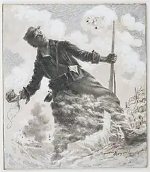 Ce dessin fut utilisé comme affiche dans le cadre de la journée du Poilu les 25 et 26 décembre 1915, organisée par le Parlement. Le but de cette œuvre est alors d’inciter les français à participer à la "quête de Noël des Poilus"[3]. Dans la version de l’affiche, la représentation diffère légèrement. L’image se met alors au service de la communication de l’Etat. Le paysage et ici une ville en ruines sur fond d’explosion, ce qui participe encore plus à la glorification du soldat représenté. Par ailleurs, le ciel est teinté de rouge dans cette dernière version.