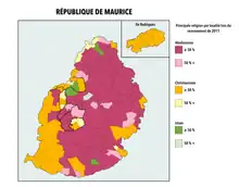 La population mauricienne est multilingue, la plupart des Mauriciens parlant couramment le créole mauricien, le français (environ 73 %[36]) et aussi l'anglais. Tandis que le français et l'anglais sont appris dès la première année du cycle primaire en tant que matières obligatoires, les langues orientales et le créole mauricien sont également enseignés en tant que matières optionnelles. Il existe également une répartition fonctionnelle des langues dans le pays : l'anglais et le français, langues supracommunautaires, sont utilisés dans le cadre professionnel, les langues asiatiques sont utilisées dans les activités socioculturelles des communautés originaires de l'Asie, tandis que le créole et le bhodjpouri sont cantonnés au registre familier. Le créole, à base lexicale française et enrichi d'apports provenant d'autres langues, est parlé par la majorité de la population et est considéré comme la langue nationale[37] : 84 % des Mauriciens s'expriment le plus souvent en créole à la maison[38]. Le français est surtout utilisé dans les médias et la littérature, c'est aussi la langue la plus parlée après le créole ou le bhojpuri[38]. Diverses langues ancestrales sont également parlées à Maurice, parmi lesquelles le bhodjpouri, l’hindi, le tamoul, le télougou, le marathi, le cantonais, le mandarin, le hakka, l’arabe et l’ourdou[39],[40]. Le créole rodriguais, le créole agaléen, le créole chagossien, variantes du créole mauricien, sont parlés par les gens de l'île Rodrigues, d'Agaléga et des Chagos.