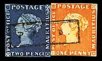 En 1846, l’Ordinance No. 13, régissant les tarifs postaux dans l'île fut promulguée. Le , l'île Maurice émit deux timbres-poste, gravés et imprimés à Port Louis par Joseph Osmond Barnard. Il y avait 500 timbres One Penny rouge-orange et 500 Two Pence bleus. Seule 15 exemplaires des premiers (dont deux non utilisés) et 12 des seconds (incluant quatre non utilisés) ont survécu l'épreuve du temps. Deux des timbres jamais utilisés sont exposés au Blue Penny Museum à Port-Louis.