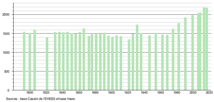 L'évolution du nombre d'habitants est connue à travers les recensements de la population effectués dans la commune depuis 1793. Pour les communes de moins de 10 000 habitants, une enquête de recensement portant sur toute la population est réalisée tous les cinq ans, les populations légales des années intermédiaires étant quant à elles estimées par interpolation ou extrapolation[4]. Pour la commune, le premier recensement exhaustif entrant dans le cadre du nouveau dispositif a été réalisé en 2008[5].