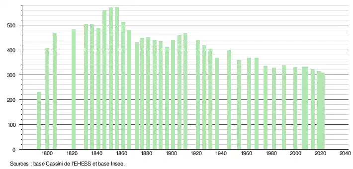 | L'évolution du nombre d'habitants est connue à travers les recensements de la population effectués dans la commune depuis 1793. Pour les communes de moins de 10 000 habitants, une enquête de recensement portant sur toute la population est réalisée tous les cinq ans, les populations légales des années intermédiaires étant quant à elles estimées par interpolation ou extrapolation[20]. Pour la commune, le premier recensement exhaustif entrant dans le cadre du nouveau dispositif a été réalisé en 2008[21]. En 2021, la commune comptait 308 habitants[Note 2], en diminution de 2,84 % par rapport à 2015 (Landes : +4,9 %, France hors Mayotte : +1,84 %). |