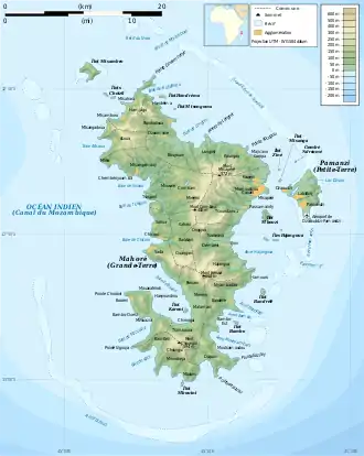 Mayotte est la plus ancienne des quatre grandes îles de l'archipel des Comores[39], chapelets de terres qui émergent au-dessus d'un relief sous-marin en forme de croissant de lune, à l'entrée du canal du Mozambique. Située à 295 km à l'ouest de Madagascar et à 67 km au sud-est d'Anjouan, parfois visible le soir en ombre chinoise, elle est composée de plusieurs îles et îlots couverts d'une végétation exubérante. Les deux plus grandes îles sont Grande-Terre et Petite-Terre, entourées par une barrière de corail vaste et complexe.