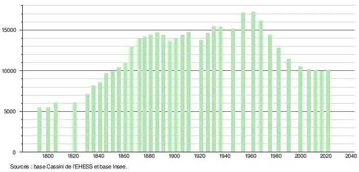 - Par convention dans Wikipédia, le principe a été retenu de n’afficher dans le tableau des recensements et le graphique, pour les populations légales postérieures à 1999, que les populations correspondant à une enquête exhaustive de recensement pour les communes de moins de 10 000 habitants, et que les populations des années 2006, 2011, 2016, etc. pour les communes de plus de 10 000 habitants, ainsi que la dernière population légale publiée par l’Insee pour l'ensemble des communes.
