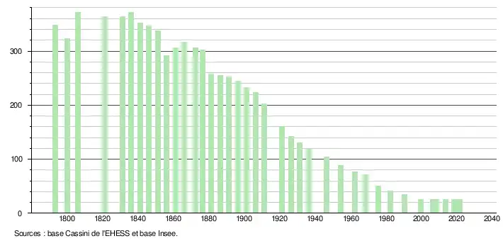 L'évolution du nombre d'habitants est connue à travers les recensements de la population effectués dans la commune depuis 1793. Pour les communes de moins de 10 000 habitants, une enquête de recensement portant sur toute la population est réalisée tous les cinq ans, les populations légales des années intermédiaires étant quant à elles estimées par interpolation ou extrapolation[31]. Pour la commune, le premier recensement exhaustif entrant dans le cadre du nouveau dispositif a été réalisé en 2008[32].