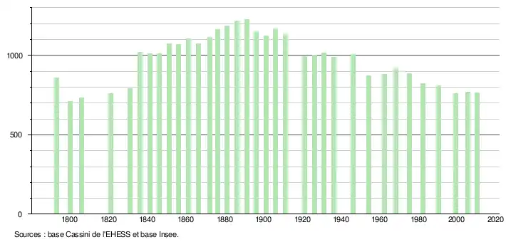L'évolution du nombre d'habitants est connue à travers les recensements de la population effectués dans la commune depuis 1793. À partir du , les populations légales des communes sont publiées annuellement dans le cadre d'un recensement qui repose désormais sur une collecte d'information annuelle, concernant successivement tous les territoires communaux au cours d'une période de cinq ans. Pour les communes de moins de 10 000 habitants, une enquête de recensement portant sur toute la population est réalisée tous les cinq ans, les populations légales des années intermédiaires étant quant à elles estimées par interpolation ou extrapolation[11]. Pour la commune, le premier recensement exhaustif entrant dans le cadre du nouveau dispositif a été réalisé en 2005[12],[Note 1].