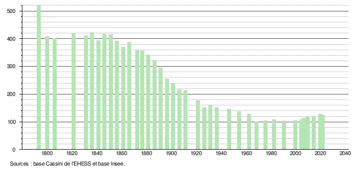 L'évolution du nombre d'habitants est connue à travers les recensements de la population effectués dans la commune depuis 1793. Pour les communes de moins de 10 000 habitants, une enquête de recensement portant sur toute la population est réalisée tous les cinq ans, les populations légales des années intermédiaires étant quant à elles estimées par interpolation ou extrapolation[26]. Pour la commune, le premier recensement exhaustif entrant dans le cadre du nouveau dispositif a été réalisé en 2004[27].