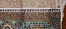 De nombreuses inscriptions en langue arabe sont calligraphiées de plusieurs façons, sculptées dans le marbre, le bois de cèdre, le plâtre ou gravées sur les céramiques excisées. Elles peuvent l'être en caractères coufiques qui sont sobres, angulaires, géométriques. Il existe cependant une variante avec des pousses végétales, des palmes prolongeant les lettres constituant le coufique fleuri. Il peut aussi s'agir de l'écriture cursive aux lettres plus souples, s'entrelaçant dans des enchevêtrements sans fin et des arabesques[1].