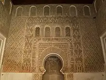 La salle de prière est encore plus riche. Elle est éclairée par dix-huit petites fenêtres avec claustras en plâtre ajouré, situées juste sous la coupole qui recouvre la nef centrale[1]. Les quatre colonnes en marbre rose dont le fut est lisse sont surmontés de chapiteaux également en marbre, décorés de motifs floraux et d'arabesques, ainsi que d'inscriptions cursives. Le mur de fond, de Kibla est couvert d'une résille de motifs végétaux au sein desquels on reconnait le motif en pomme de pin, ou plutôt en cône de cèdre, ou snouberiya[6], en relief, typique de l'art saadien[5]. L'ouverture du mihrab surmontée d'un arc outrepassée, est encadrée par une frise comportant des décors végétaux complexes et des inscriptions d'eulogie à la gloire d'Allah.