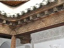 Les façades sur la cour intérieure du côté de l'entrée et de celui de la salle de prière sont particulièrement décorées. De grands panneaux de plâtre sculpté et des arcs surmontant les porches sont couverts de fins motifs végétaux et géométriques se répétant avec symétrie en une dentelle harmonieuse. Ils sont surmontés des poutres et corniches en cèdre finement sculpté.