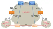 - d'au moins une passerelle multimédia (MG, Media Gateway), qui se charge de convertir les échantillons de voix et vidéo entre circuits téléphoniques et paquets réseau ;