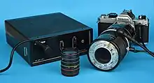 - Le kit complet comprend l’objectif proprement dit, six bonnettes d’approche, un câble d’alimentation spécial haute tension, un bouchon avant et un bouchon arrière, un capuchon de sécurité à placer sur la griffe porte-accessoires (risque d’électrocution), quatre lampes à bulbe, une alimentation en courant continu, une sacoche, un câble de synchronisation