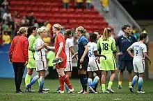 Lors de la demi-finale contre le Canada à Old Trafford, Rapinoe a marqué deux buts égalisateurs aux 54e et 70e minutes. Son premier but a été marqué directement à partir d’un corner. Elle est la première et jusqu’à présent la seule joueuse, homme ou femme, à avoir marqué un but olympique aux Jeux Olympiques[95]. Les États-Unis ont vaincu le Canada 4-3 avec un but dans les arrêts de jeu à la 123e minute par Alex Morgan. Avec ses deux buts, Rapinoe est l’une des cinq seules joueuses, dont Wei Haiying, Cristiane, Angela Hucles et Christine Sinclair, à avoir marqué deux buts lors d’une demi-finale olympique[96],[97].