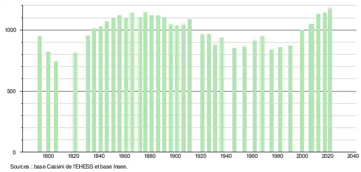 | L'évolution du nombre d'habitants est connue à travers les recensements de la population effectués dans la commune depuis 1793. Pour les communes de moins de 10 000 habitants, une enquête de recensement portant sur toute la population est réalisée tous les cinq ans, les populations légales des années intermédiaires étant quant à elles estimées par interpolation ou extrapolation[24]. Pour la commune, le premier recensement exhaustif entrant dans le cadre du nouveau dispositif a été réalisé en 2007[25]. En 2021, la commune comptait 1 176 habitants[Note 3], en augmentation de 2,98 % par rapport à 2015 (Landes : +4,9 %, France hors Mayotte : +1,84 %). |