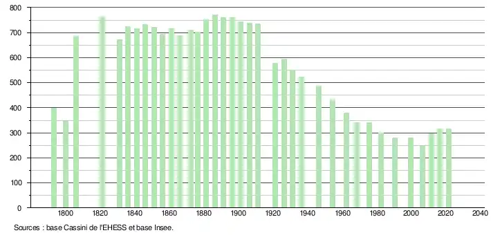 L'évolution du nombre d'habitants est connue à travers les recensements de la population effectués dans la commune depuis 1793. Pour les communes de moins de 10 000 habitants, une enquête de recensement portant sur toute la population est réalisée tous les cinq ans, les populations légales des années intermédiaires étant quant à elles estimées par interpolation ou extrapolation[23]. Pour la commune, le premier recensement exhaustif entrant dans le cadre du nouveau dispositif a été réalisé en 2006[24].