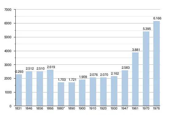 Les chiffres des années 1831 à 1970 tiennent compte des chiffres des anciennes communes fusionnées.
