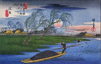 Les voyages à l’intérieur du Japon se sont développés avec l’époque d'Edo et la pacification du pays qu’elle a apportée. Si la plupart de ces voyages étaient nécessités par des impératifs politiques, ou économiques, les voyages d’agrément se développèrent aussi à cette époque, voyant apparaître des guides de voyages (meisho ki) et toute une littérature, dont l’ouvrage le plus connu reste le Tōkaidōchū Hizakurige de Jippensha Ikku. Après la littérature et les guides, l’image se développe progressivement dans l’estampe ukiyo-e au XIXe siècle, grâce en particulier à Hokusai et Hiroshige, qui multiplièrent les séries d’estampes meisho-e à partir des années 1830. Hokusai expérimente le genre avec ses Huit Vues d’Edo à la manière hollandaise, où ses influences européennes sont évidentes ; le succès de sa série des Trente-six vues du mont Fuji confère au genre de l’estampe de paysage une place prépondérante au XIXe siècle[17]. Si l’art de Hokusai est animé d’un style spirituel aux compositions analytiques, son jeune « concurrent » Hiroshige présente des œuvres marquées par la sensibilité et la prépondérance de l’humain. Ses séries les plus connues sont Les Cinquante-trois Stations du Tōkaidō, Les Soixante-neuf Stations du Kiso Kaidō et les Cent vues d’Edo[18].