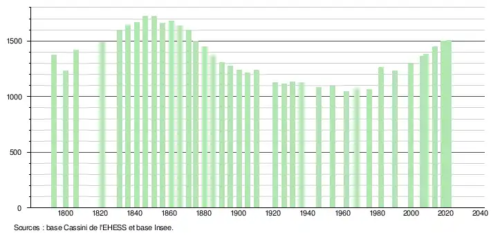 L'évolution du nombre d'habitants est connue à travers les recensements de la population effectués dans la commune depuis 1793. Pour les communes de moins de 10 000 habitants, une enquête de recensement portant sur toute la population est réalisée tous les cinq ans, les populations légales des années intermédiaires étant quant à elles estimées par interpolation ou extrapolation[19]. Pour la commune, le premier recensement exhaustif entrant dans le cadre du nouveau dispositif a été réalisé en 2008[20].